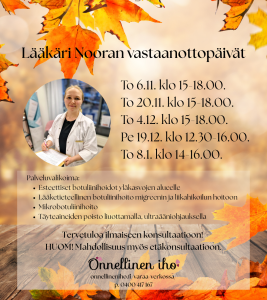 Lääkäri Noora käy Onnellisessa ihossa säännöllisesti pitämässä vastaanottopäivää (botuliinihoidot, täyteaineiden poistot). Tässä Nooralle sovitut seuraavat päivät: