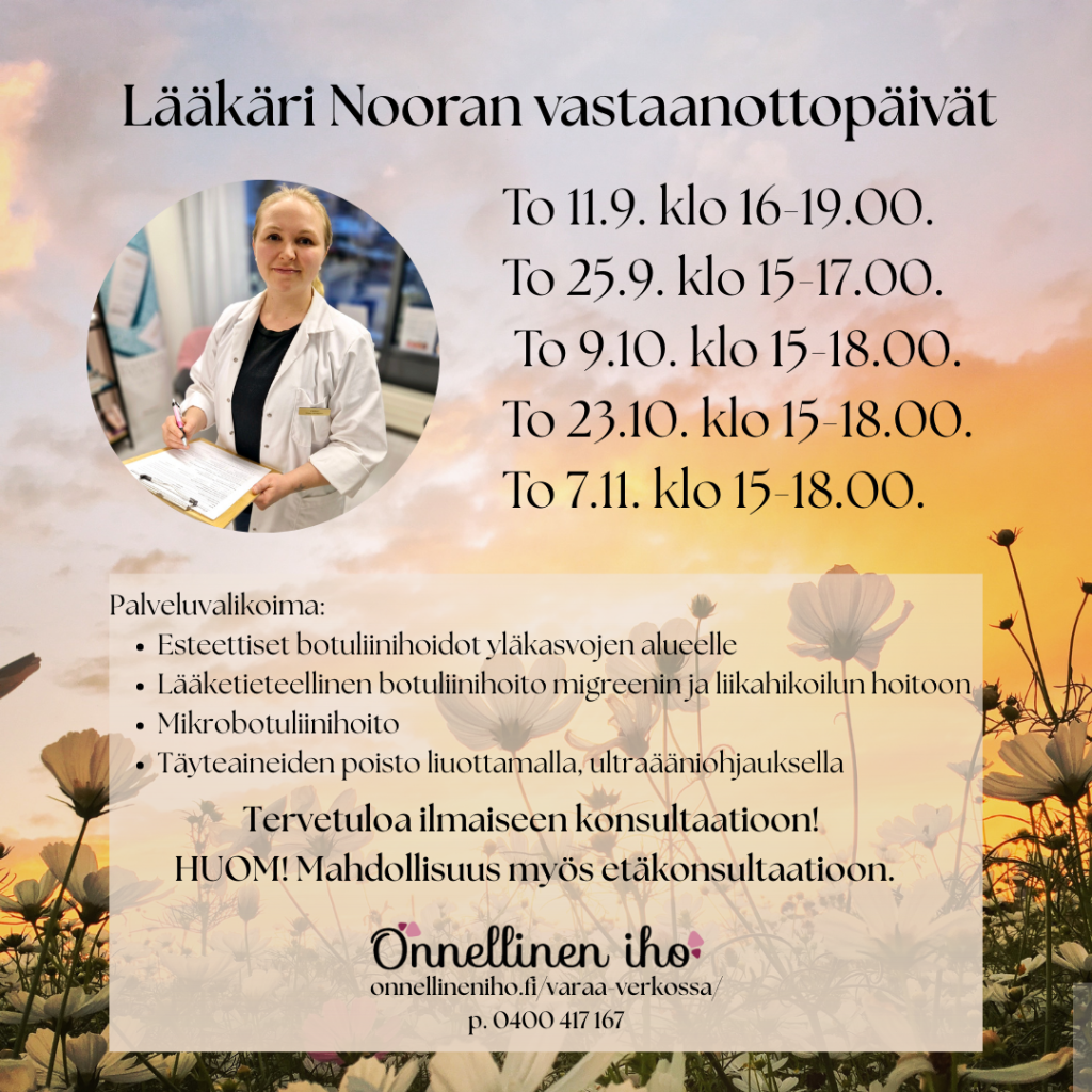 Lämpimästi tervetuloa turvallisen ja lämminhenkisen lääkäri Nooran vastaanotolle. Lääkäri Nooran palveluvalikoimiin kuuluvat: esteettiset botuliinihoidot (hoidoissa käytetään Botoxin rinnakkaisvalmistetta), lääketieteellinen botuliinihoito migreenin ja liikahikoilun hoitoon (Botox), mikrobotuliinihoito sekä täyteaineiden poistot liuottamalla, ultraääniohjauksella.